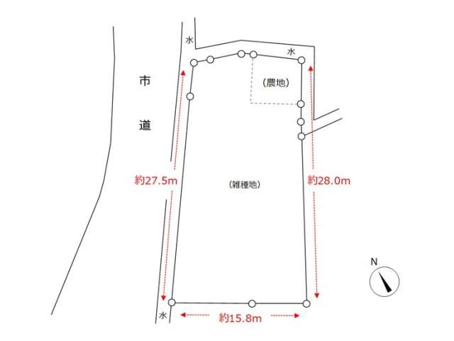 | 備考 | 現況の引き渡しとなります。 本物件は雑種地363㎡、田30㎡の合計393㎡となります。 北西側の道路(水路敷地を経て)は市道(花岡大釈迦線/平均幅員7.5m)です。 本物件敷地と北西側の道路の間には水路敷地があるため、建築基準法に定める道路に接しておらず、 建築基準法に定める接道義務を満たしていないため、建築確認取得には、水路の一部について、 建築基準法第43条に適合する接道長さ分の占用使用許可が必要となります。 本物件への水道の引き込みはございませんので、前面道路内の本管(DIP200mm)より引き込みが必要です。 敷地内に下水公設マス有り。 敷地内に東北電力様が管理する電柱の支線(1本)があります。 ※同業他社による客付け可 | ||